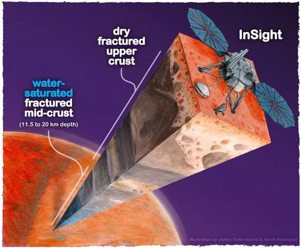 NASA的洞察号着陆器下方的火星内部剖面图(图片:詹姆斯·塔特尔·基恩和亚伦·罗德/SWNS)
