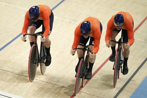 法国,MONTIGNY-LE-BRETONNEUX(美联社)——周二晚上,荷兰的罗伊·范登伯格、哈里·拉夫雷森和杰弗里·胡格兰成功卫冕了他们的奥运团体短跑金牌,轻松击败了英国三人组埃德·洛、哈米什·特恩布尔和杰克·卡林,同时打破了他们自己在晚上早些时候创造的世界纪录。