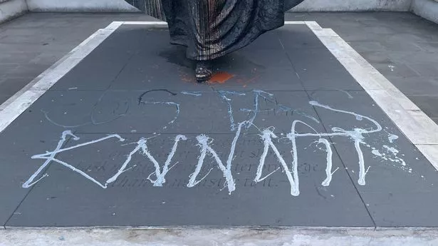 一种桔黄色和白色的物质溅到了雕像上(图片:在一次种族主义袭击中,玛丽·西科尔的雕像被红白相间的物质破坏。每日镜报》)