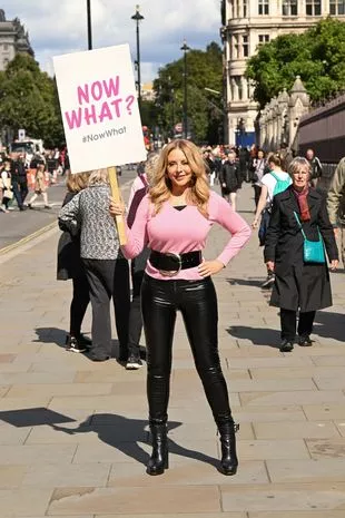 周四,卡罗尔·沃尔德曼身着紧身上衣和PVC裤子,在英国议会大厦外为她的新书《现在是什么?》《修复破碎的英国》