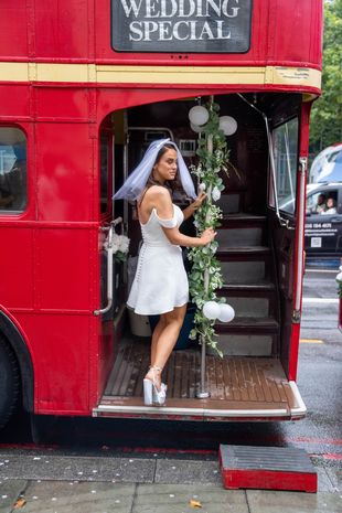 维姬·帕蒂森在与埃尔坎·拉马丹结婚后登上了一辆伦敦婚礼专用红色巴士(图片:/ SplashNews.com)