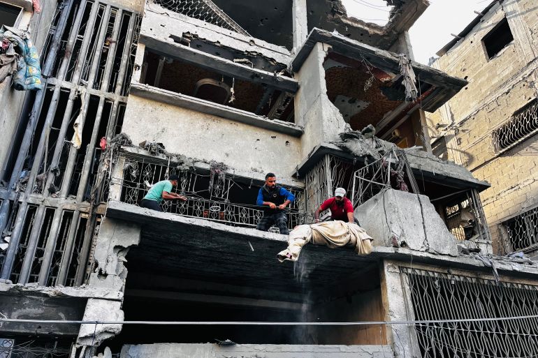 半岛电视台(Al Jazeera)获得的以色列周一袭击阿布•纳斯尔(Abu Nasr)家的录像显示,一名浑身是灰尘的巴勒斯坦男子被困在混凝土和钢筋下,其他人试图用镐击碎墙壁来解救他。在大楼外,几具裹着毯子的尸体躺在地上。