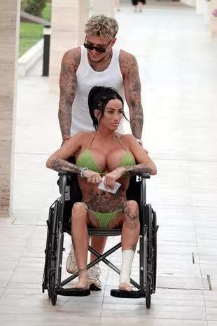 身穿比基尼的凯蒂·普莱斯被拍到脚踝绑着绷带坐在轮椅上,男友JJ·斯莱特在度假时推着她四处走动。