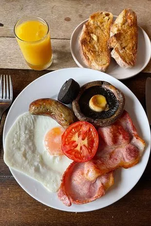 她的伴侣点了全套威尔士早餐,外加两片吐司。他对所有的菜都做得完美无缺赞不绝口,声称味道都很棒,但他指出,蘑菇是这盘菜中“意想不到的明星”,与培根不相上下。