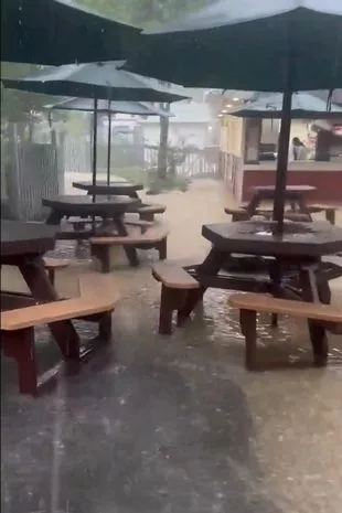 在网上分享的多莱坞现场的视频显示,野餐桌和雨伞被倾盆大雨砸得粉碎。游客们在齐脚踝深的水里涉水,水很快就涨到了腰部。