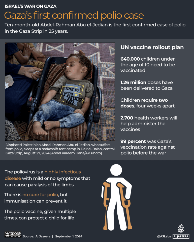 根据联合国巴勒斯坦难民救济和工程处(UNRWA)的说法,为加沙儿童接种脊髓灰质炎病毒疫苗的运动在北部继续进行,“不顾一切”,包括以色列袭击联合国卫生工作者和他们的车辆。