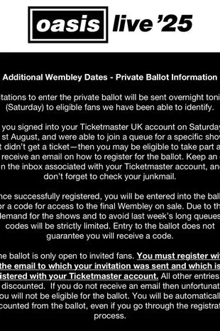 收到电子邮件的球迷将参加投票,以获得温布利额外日期的门票销售代码。他们坚称门票将“严格限制”,并且“只对受邀的粉丝开放。”Oasis补充道:“你必须用收到邀请的电子邮件进行注册,该电子邮件是用你的Ticketmaster账户注册的。”