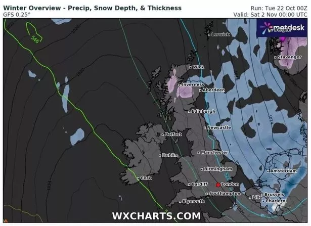 WX Charts利用Met Desk的数据绘制的天气图显示,在11月2日,长达150英里的寒冷天气可能会使全国大片地区被大雪覆盖,许多人将在这个周末庆祝万圣节。