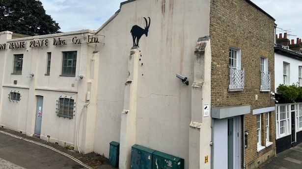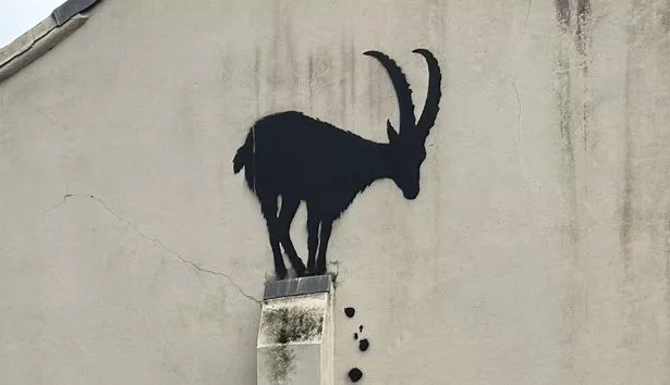 班克斯的一幅新作出现在伦敦,画中一只山羊在一堵又高又薄的墙上摇摇欲坠地保持平衡。随着岩石和碎石的翻滚,这只动物似乎马上就要摔倒了