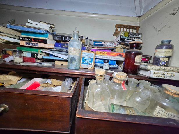 在谈到室内区域时,他说:“除了一些涂鸦外,这个地方的内部状况非常好,有些东西已经被洗劫和偷走了,但你可以看出这里曾经住过一辈子。”瓶子里的各种化学品到处都是,还有科学设备,我不知道它们是用来做什么的。以及各种各样的古董和记忆只是留下枯萎和腐烂。
