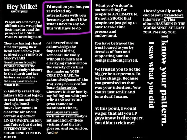 Jaime说Shinoda和林肯公园乐队的其他成员——Brad Delson、Phoenix和Joe Hahn——“背叛了信任”,“未能解决他们不同粉丝群的担忧”。