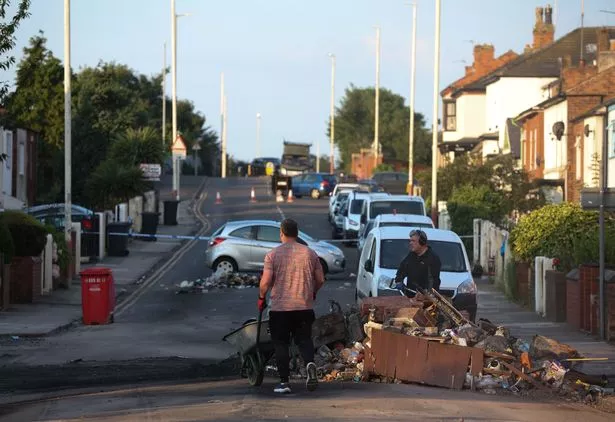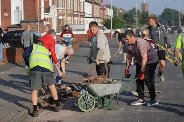 当地人聚集在一起清理昨晚骚乱的残余(图片来源:Adam Gerrard / Daily Mirror)
