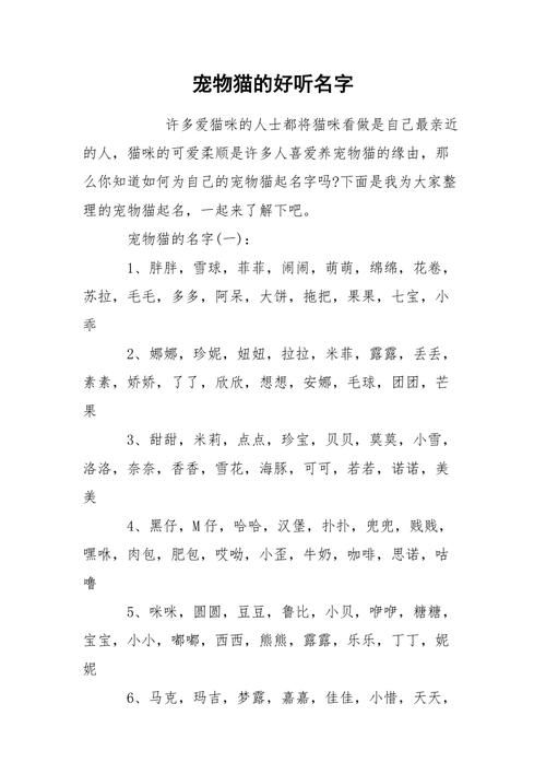 根据这些特点来选择一个与其个性相符的名字。比如,如果你的猫咪很活泼好动,可以考虑一些生动活泼的名字,如Whisker、Misty等。