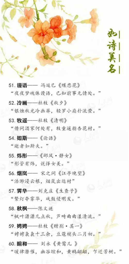 当我们选择诗句时,需要注意诗句的意境和寓意。在选择时,可以通过参考古诗词、民歌谣、现代诗歌等,以及从生活中提取出描绘情感和情景的短语和句子。比如,《诗经》中的“北方有佳人,绝世而独立”,意境优美,可以用于取女孩名字;或者《离骚》中的“海内存知己,天涯若比邻”,也能用于取男孩名字,并体现出名字与友情的羁绊。
