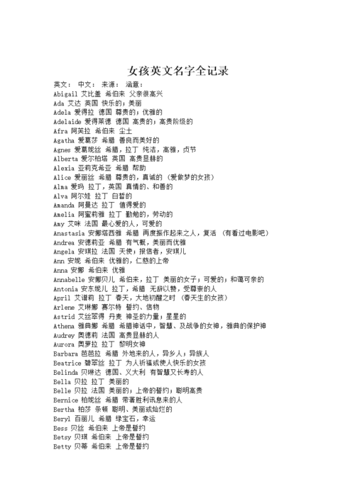 女孩英语名字的起名文化是一个复杂而多维的话题,涉及历史、社会、文化和个人价值观等多个层面。通过了解这些背后的文化意义和趋势,我们不仅能更好地理解名字的选择,能洞察社会的变化和发展。